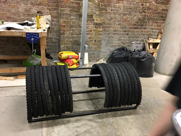 Rapha Supercross held their annual cycling competition on Granary Square, King's Cross, alongside Central Saint Martin's 1st Year Architecture student's furniture and obstacles. I designed and made a bench for the spectators that was made from a welded metal frame, second-hand bicycle tyres and a concrete base. The final design was spray painted in Rapha's colours.